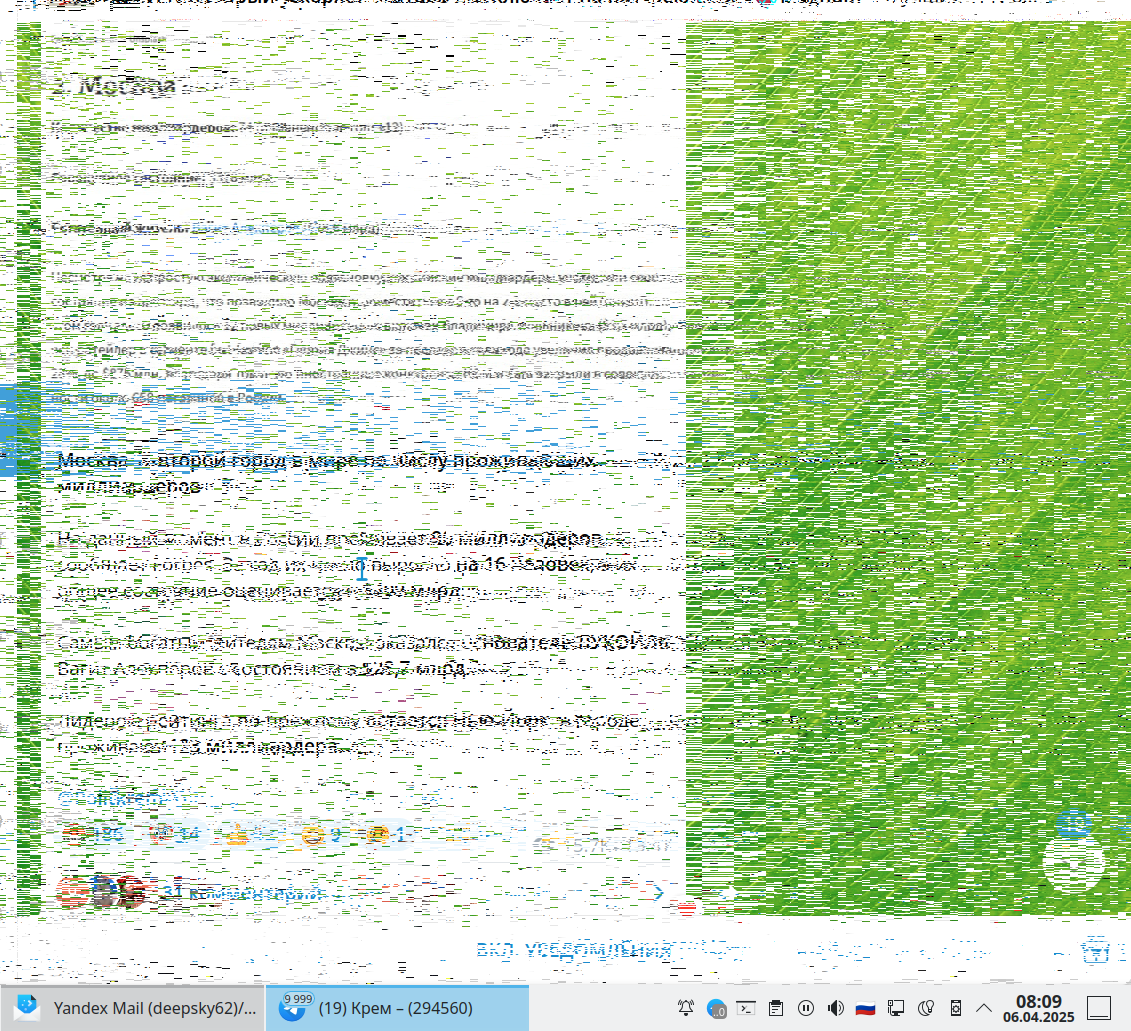 Озу прогнал тест все нормально, видеокарта старая Nvidia драйвер Nouveau появляется это пока заметил только в телеге, но потом появляется на других экранах... После перезагрузки все нормально, пока видео в телеграмме не посмотришь)