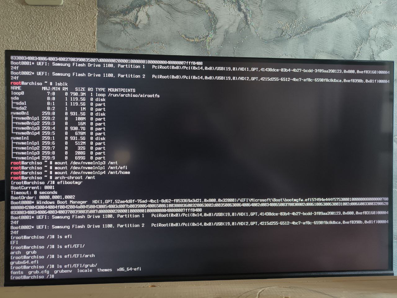 При установке arch на китайскую мать с nvme-диском всегда устанавливал загрузчик systemd-boot (bootctl install) c последующей настройкой загрузчика. Но в этот раз не "взлетело", система не загрузилась. И, впервые решил воспользоваться загрузчиком grub. Через установочную флешку чрутнулся в систему доустановил grub и efibootmgr.